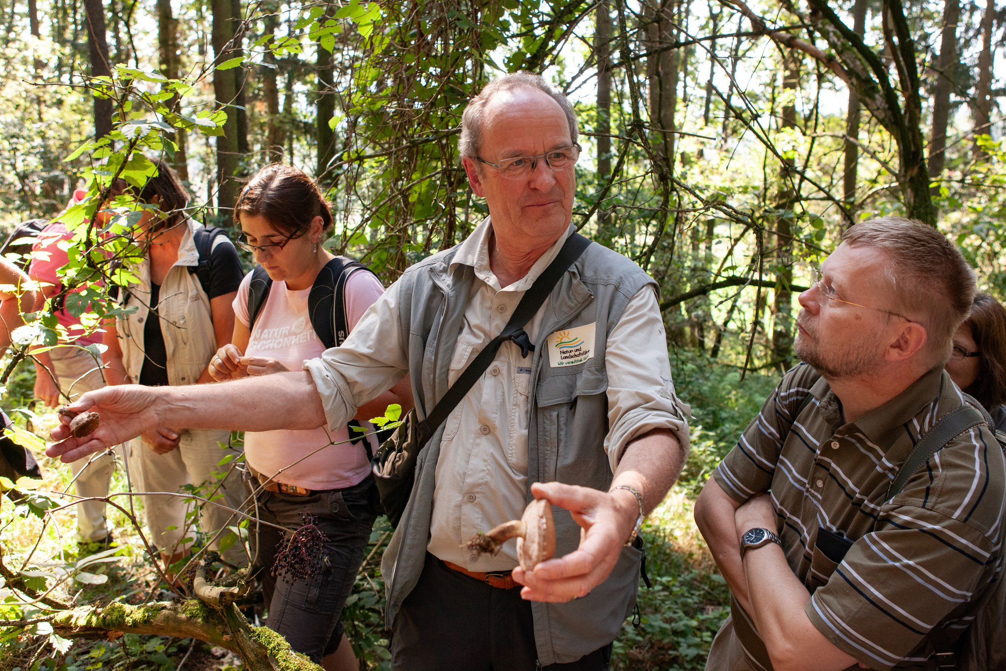 Guide putzt Pilze mit Personen rundherum